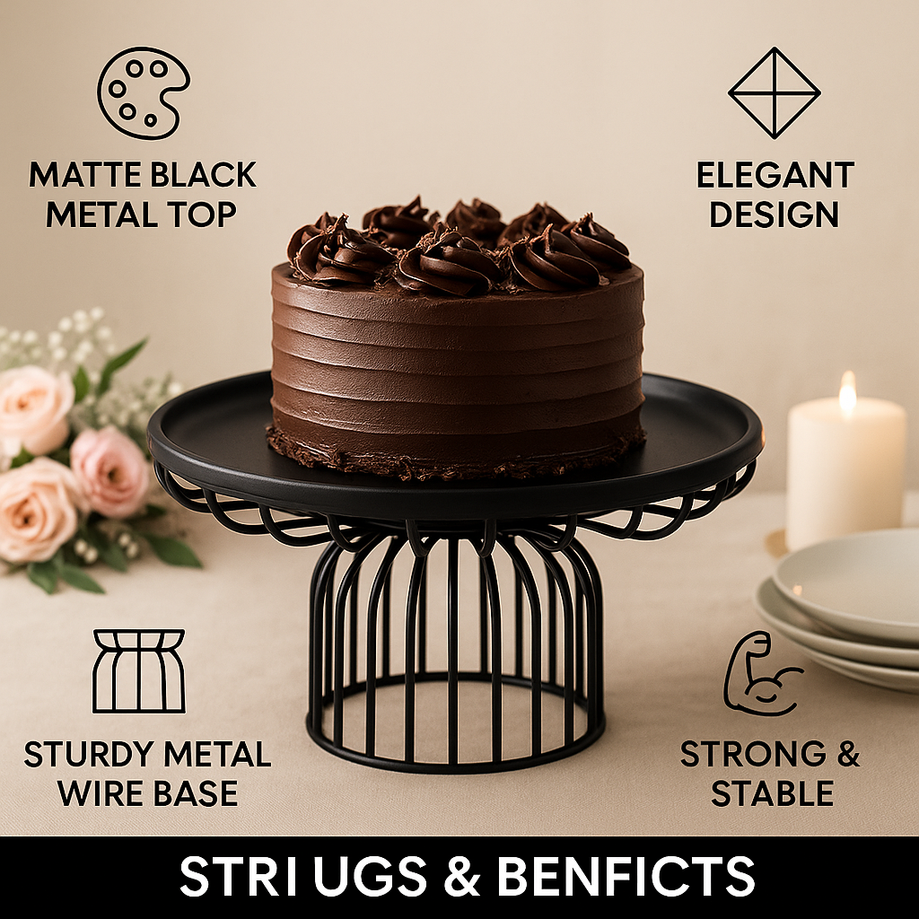 Display your cakes and desserts in style with this modern black metal cake stand. Designed with a sturdy wire base and sleek matte tray, it adds a sophisticated touch to any table. Perfect for cakes, cupcakes, pastries, and party displays. Ideal for birthdays, weddings, and special occasions.